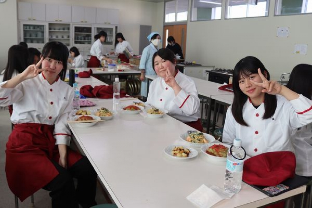 生活文化コース3年生のフードデザインの授業で、今までの学習の成果を生かし、自分たちで献立を考えて調理実習に取り組みました。テーマは「パスタ料理」で主菜と副菜の3品をつくりました。パスタは、トマトソースやカルボナーラ、ペペロンチーノなど、主菜では、鶏肉のソテーやミネストローネ、ロールキャベツなどがありました。他のグループの料理を食べて、「むちゃくちゃ美味しい!」という感動の声も聞かれました。ぜひ家庭でも腕を振るってくださいね。