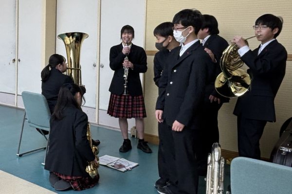 吹奏楽部は、1月10日(土)に幸田町民会館で行われた「愛知県アンサンブルコンテスト 西三河北地区大会」に出場しました。演奏曲は、広瀬勇人作曲の「マイホームタウン」です。3年生引退後、1・2年生だけでチャレンジする初めての大会でした。コンクールでは緊張しながらも一生懸命、自分たちの想いをこめた演奏をすることができました。翌週の反省会では部長から、「音程に気を付けてもっと良い音色になるよう練習したい」、「次の演奏会に向けてしっかり準備したい」といった前向きな目標を聞くことができました。少人数のアットホームな雰囲気で日々練習を頑張っている吹奏楽部のさらなる成長に期待しています。応援に駆けつけて演奏を聴いてくださった保護者の皆様、ありがとうございました。