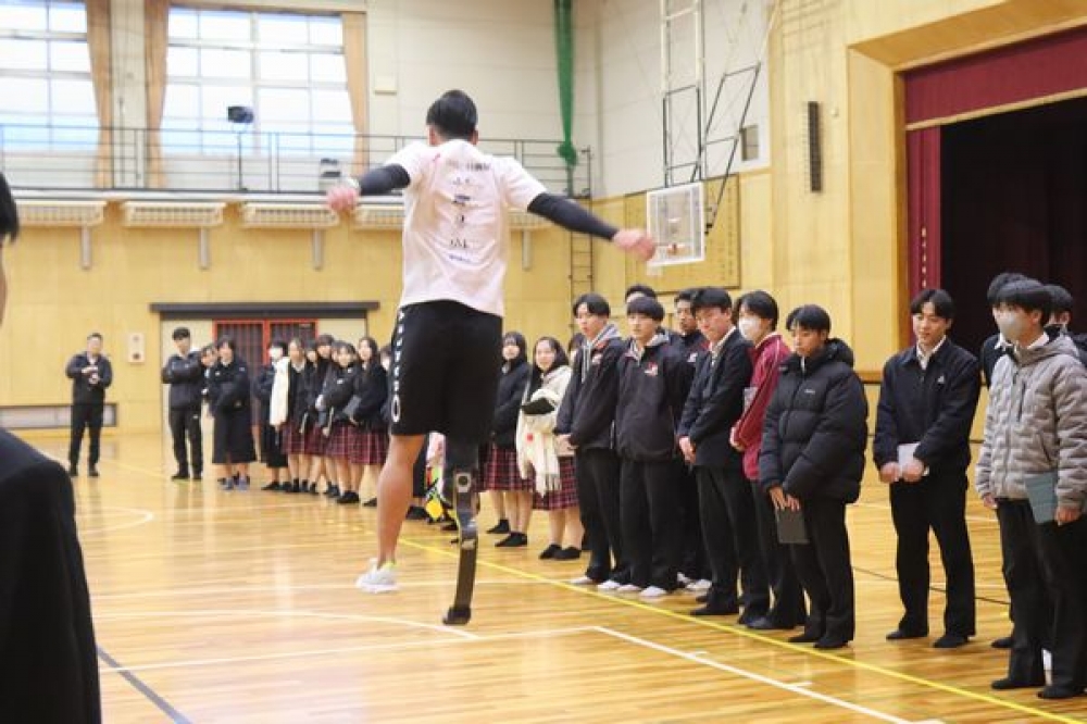 パリパラリンピック陸上競技日本代表 井谷俊介選手を招き、スポーツ選抜コース2・3年生に「夢の力」と題して講演をしていただきました。夢や目標の重要性や当たり前に感謝すること、周りの人を笑顔にすることの大切さなど多くのことを学びました。講演後には体育館で走る姿も見せていただきました。生徒にも気さくに話しかけていただき、大変貴重な経験となりました。生徒は、「自分では想像もできないくらい大変な経験をしたのに、常に前向きで頑張る姿に感動しました」と話していました。