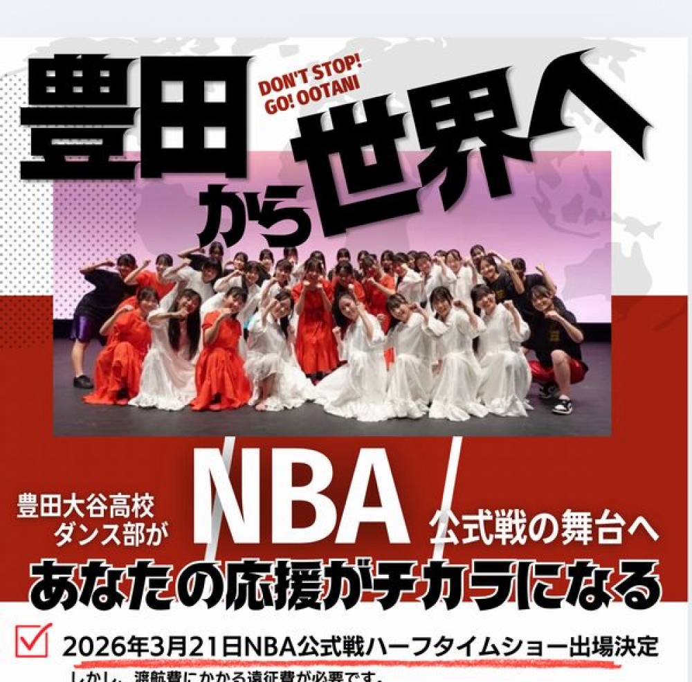 2026年3月21日(土)午後5時(日本時間3月22日(日)午前6時)からCapital One Arena(アメリカ・ワシントンD.C.)で行われるNBAのワシントン・ウィザーズ対オクラホマシティ・サンダーの試合でのハーフタイムショーに豊田大谷高校ダンス部がダンスを披露します。