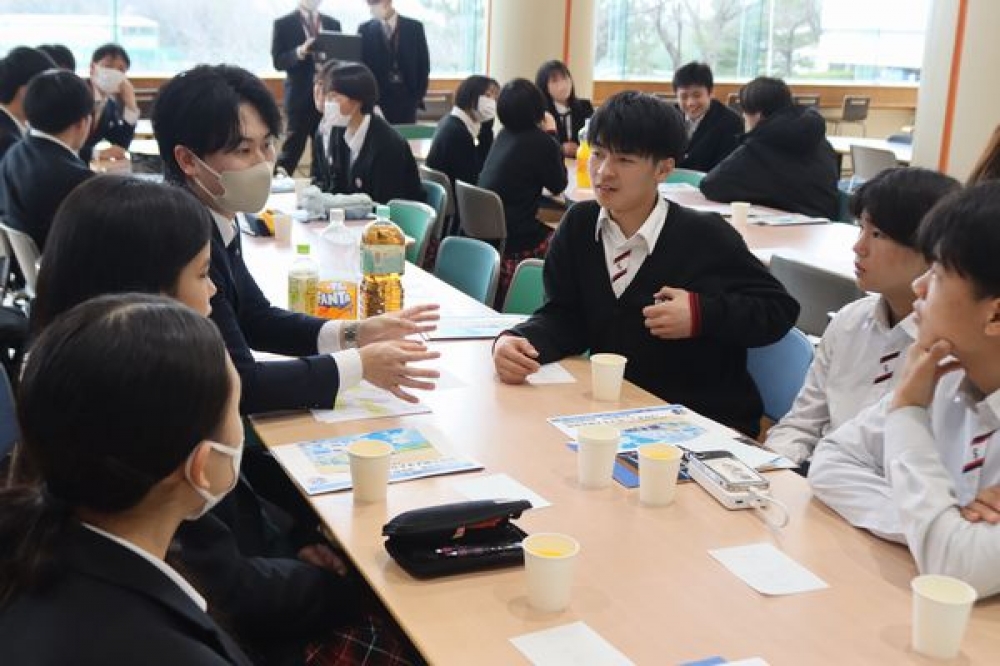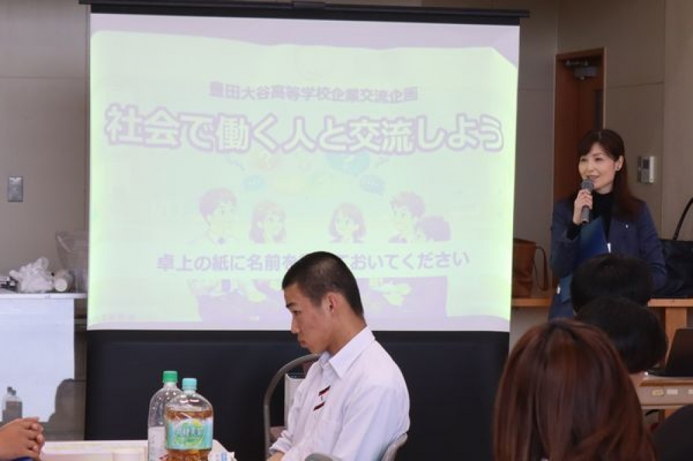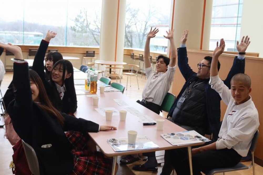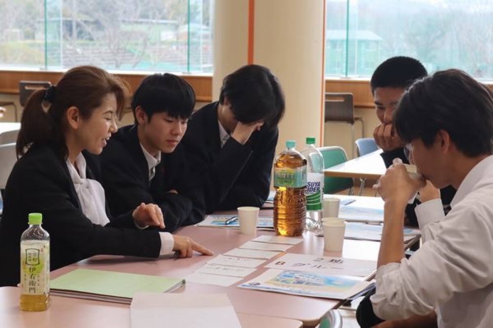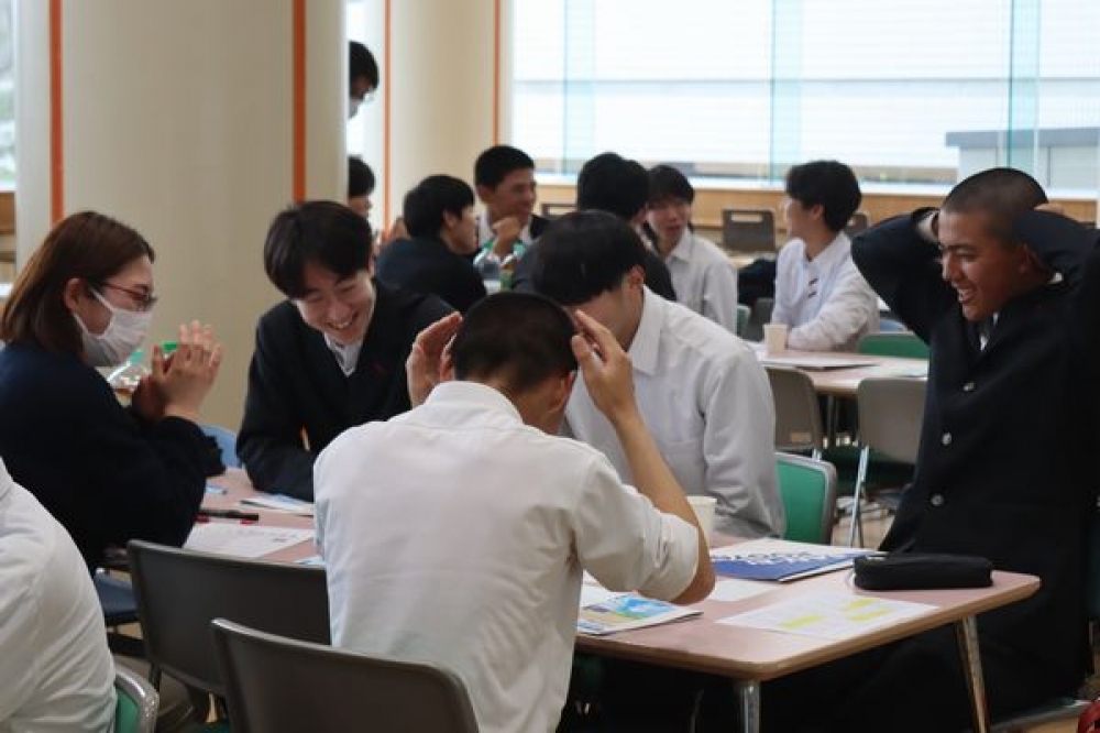 グループに分かれて自己紹介を行った後、2種類のグループ交流を楽しみました。はじめに行った緊張をほぐすアイスブレイクのミニゲームでは、楽しく話し合いながら課題解決に取り組みました。2つ目は、企業の方が書いたベスト3を見て、隠されたテーマを当てるものでした。「信頼される人」という隠しテーマでは、働くときに必要とされる資質能力について知ることができました。生徒からは、「はじめは緊張したけれど、企業の方から、いろいろな話が聞けて楽しかった」という感想が聞かれました。実際に働く方との交流をとおして、将来の進路選択やキャリア形成について考える貴重な機会となりました。