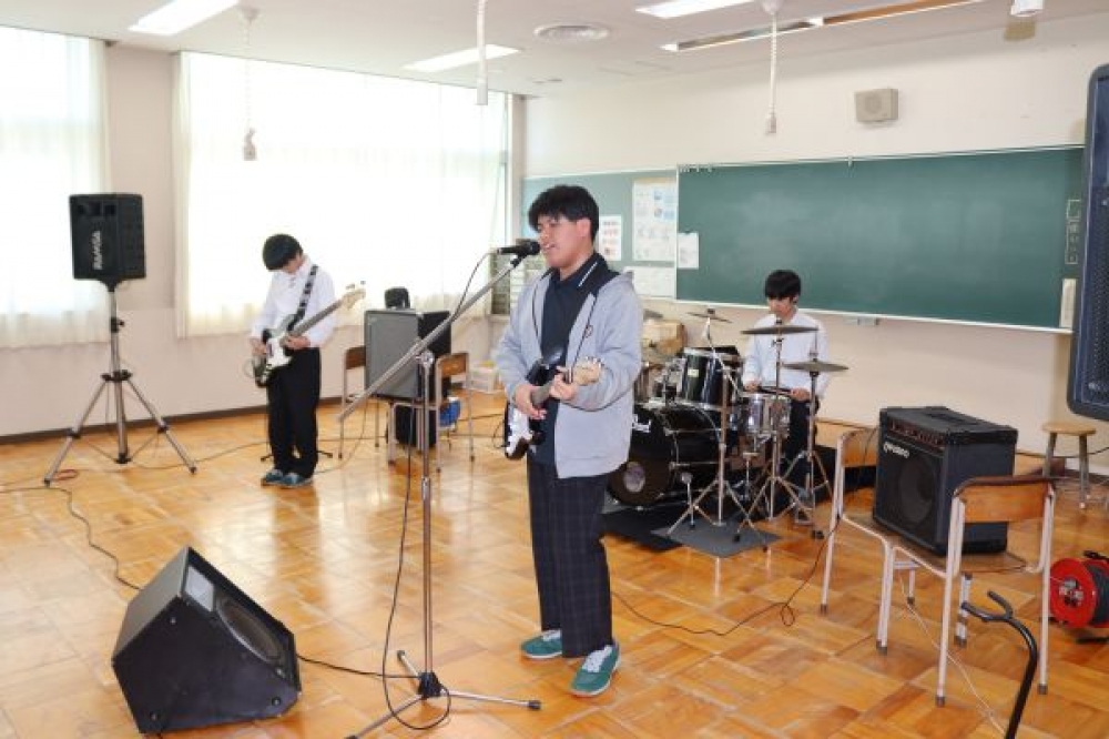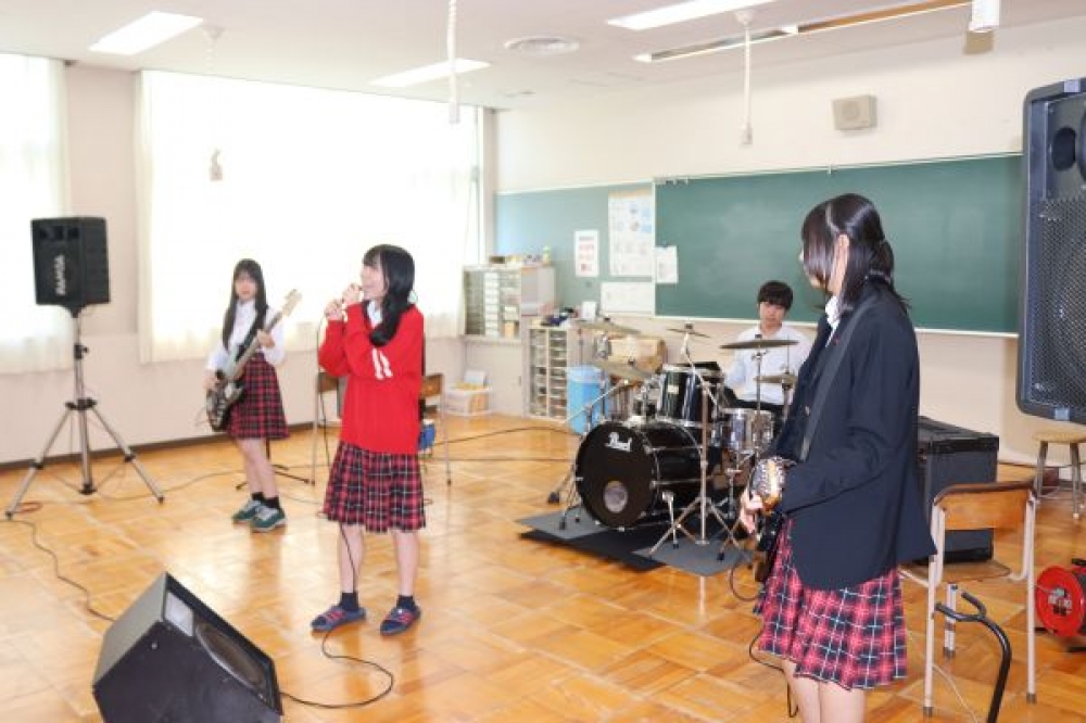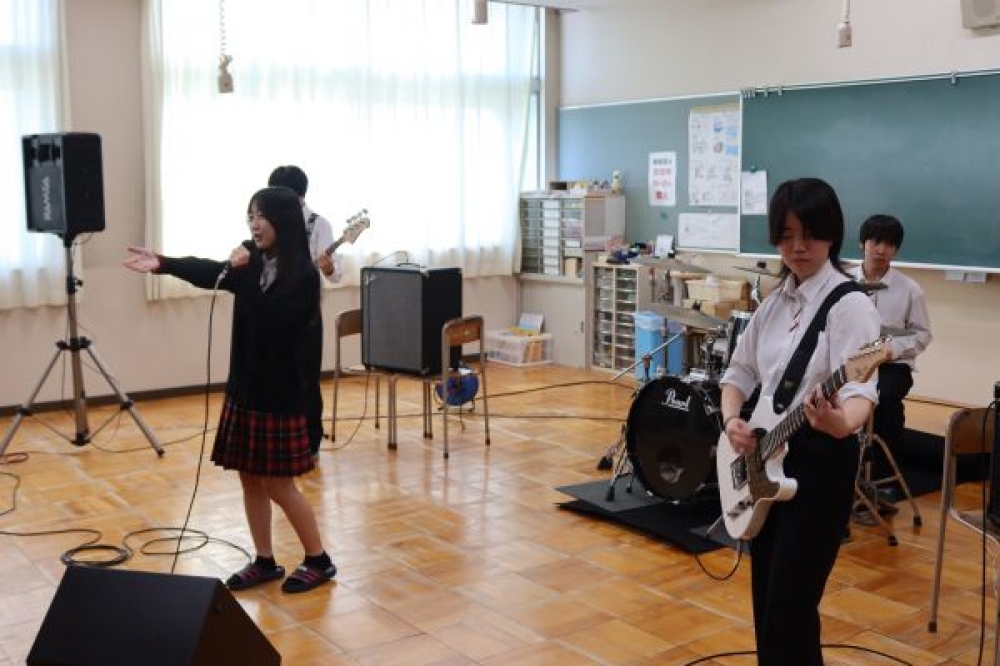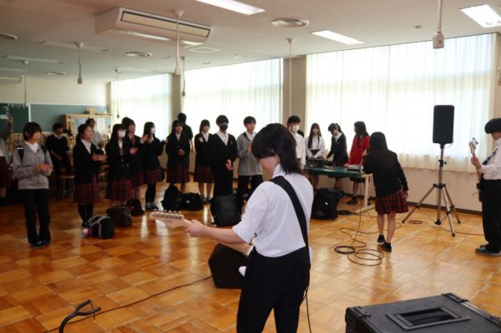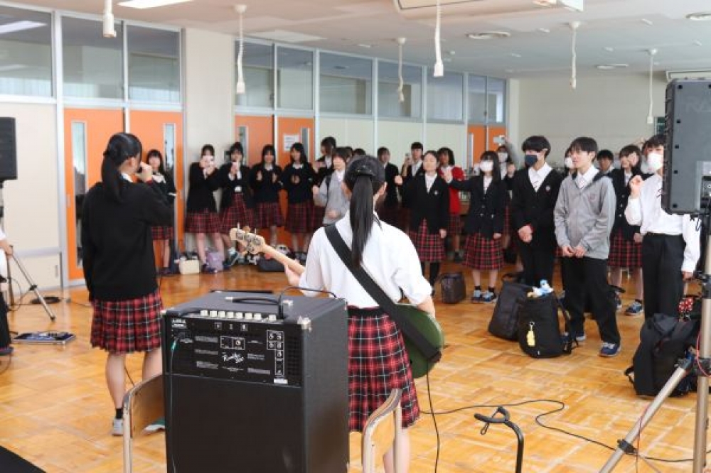 4月21日(火)の授業後に、軽音楽部が新入生を歓迎するミニコンサートを開きました。会場は、軽音楽部に関心をもっている新入生や、演奏を聴きに集まった2・3年生でいっぱいとなり、熱気あふれるコンサートになりました。